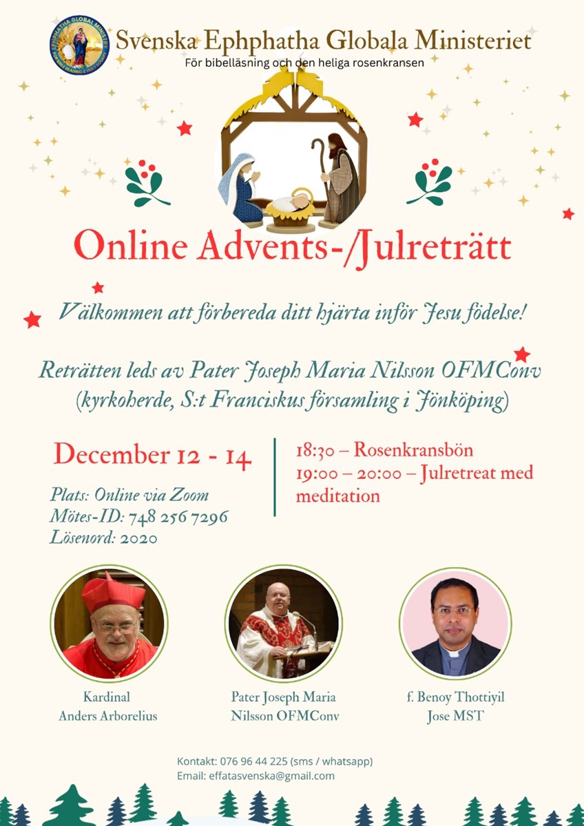 Svenska Ephphatha Globala Ministeriet organiserar en online-reträtt i förberedelse inför julen, ledd av Pater Joseph Maria Nilsson OFMConv (kyrkoherde, S:t Franciskus församling i Jönköping). Retreaten hålls från den 12 till 14 december 2025, varje kväll kl. 18:30–20:00. Rosenkransbönen börjar kl. 18:30, följt av meditation och julretreat kl. 19:00.