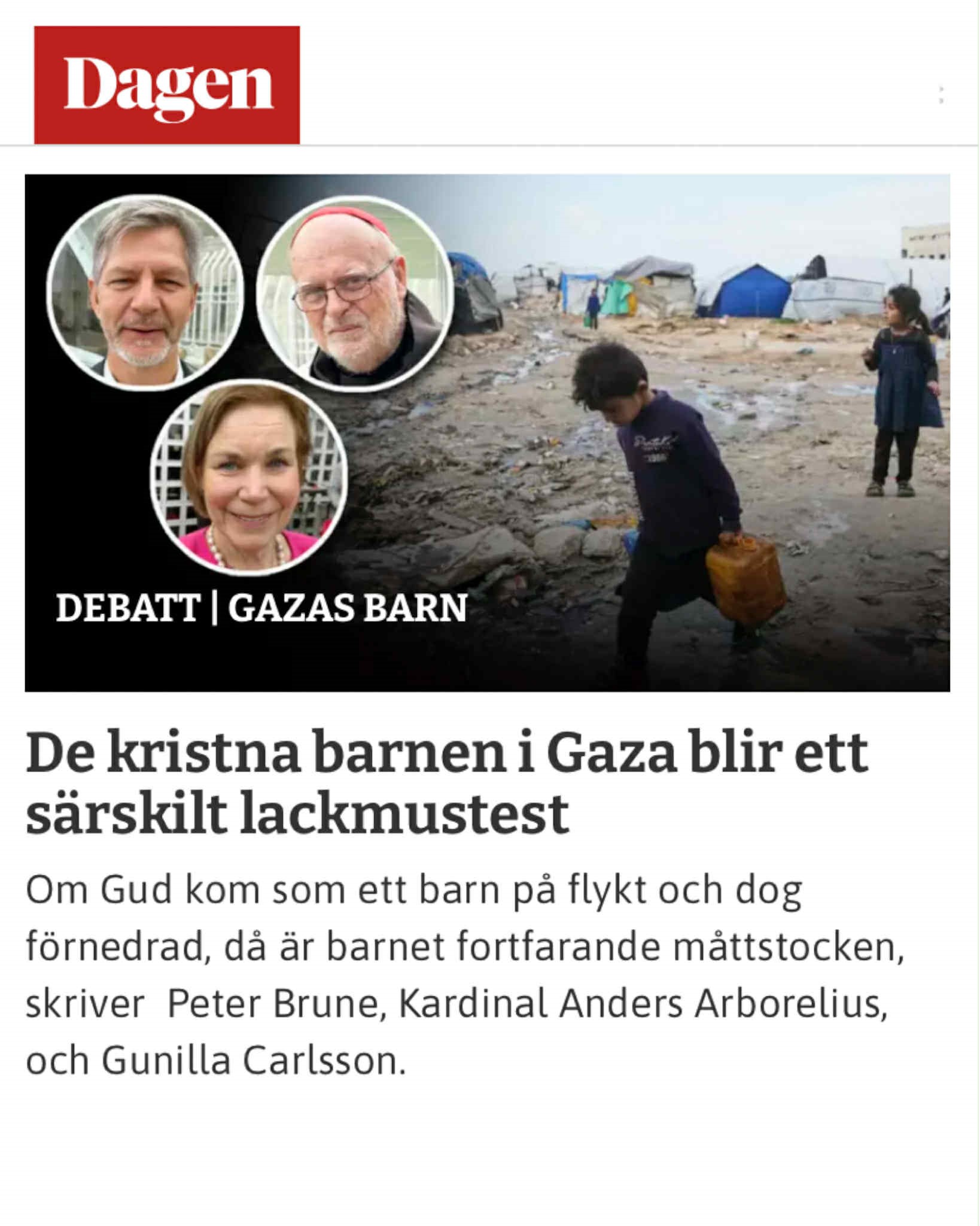 I en debattartikel i tidningen Dagen skriver kardinal Anders Arborelius, Caritas Sveriges generalsekreterare Peter Brune och Sidas styrelseordförande Gunilla Carlsson om den skriande nödvändigheten av att värna barns människovärde i Gaza.