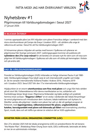 Ledningsgruppen kommer att publicera ett nyhetsbrev den 27:e varje månad för att berätta om senaste nytt för dem som vill resa som pilgrimer till Världsungdomsdagen i Sydkorea och alla som vill stötta på hemmaplan i förbön och på andra sätt.