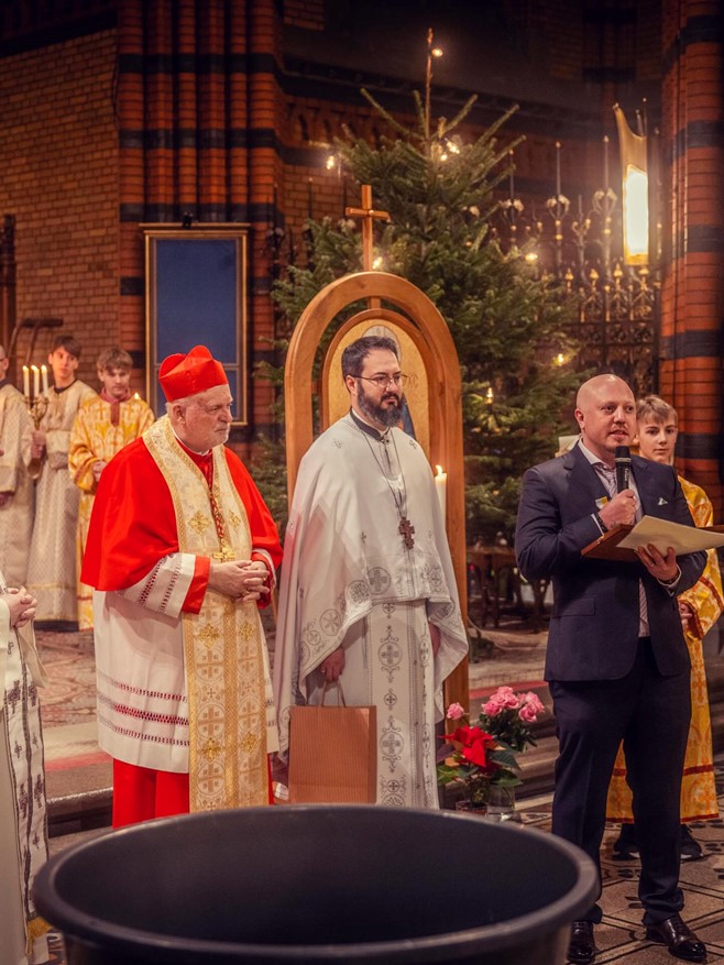 Kardinal Anders Arborelius, f Andriy Melnychuk från ukrainska missionen och Sebastian Stakset vid medaljutdelningen. Foto: Rickard L. Eriksson