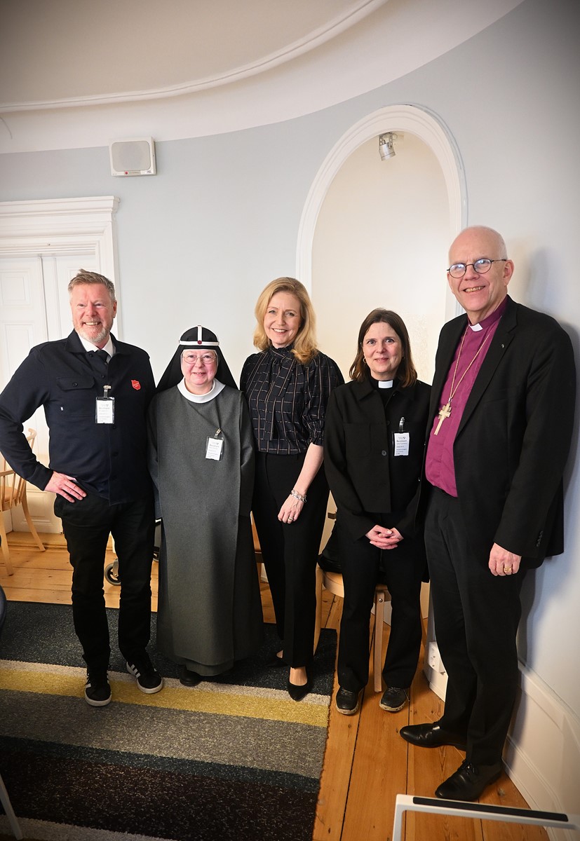 Från vänster: Bo Jeppsson från Frälsningsarmén, sr Beata Rohdin O.Ss.S, Elisabeth Thand Ringqvist, Sofia Camnerin från Sveriges kristna råd samt ärkebiskop Martin Modéus från Svenska kyrkan.