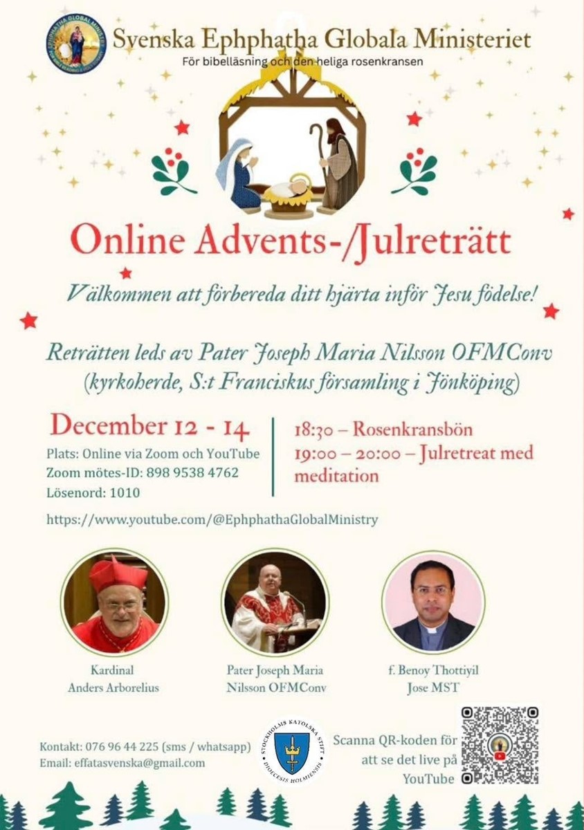 Svenska Ephphatha Globala Ministeriet organiserar en online-reträtt i förberedelse inför julen, ledd av Pater Joseph Maria Nilsson OFMConv (kyrkoherde, S:t Franciskus församling i Jönköping). Retreaten hålls från den 12 till 14 december 2025, varje kväll kl. 18:30–20:00. Rosenkransbönen börjar kl. 18:30, följt av meditation och julretreat kl. 19:00.