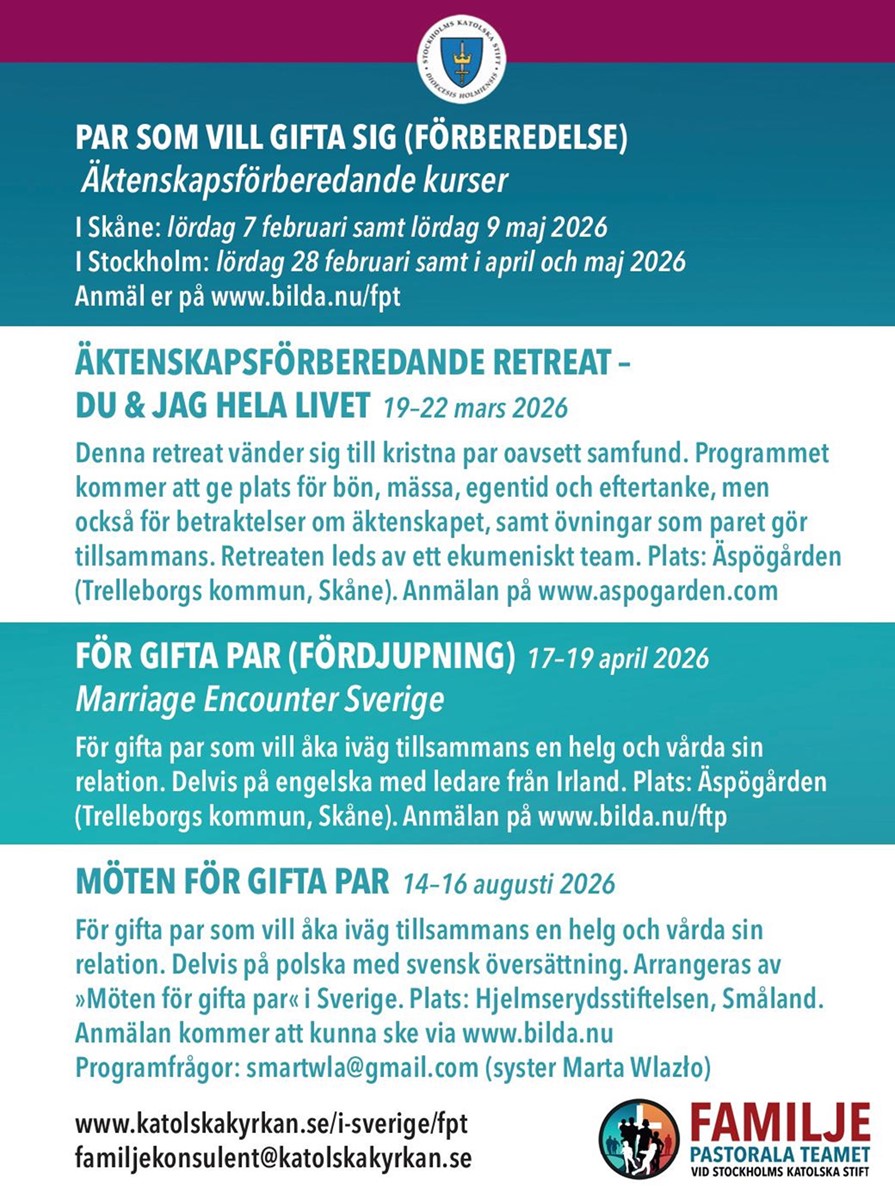 Helgen vänder sig till gifta par som vill vårda sitt äktenskap och fördjupa sin kommunikation. Reträtten använder sig av upplägget hos World Wide Marriage Encounter. Reträtten hålls på Äspögården (Trelleborgs kommun, Skåne). Anmälan och information finns på www.bilda.nu/fpt Programfrågor: familjekonsulent@katolskakyrkan.se.